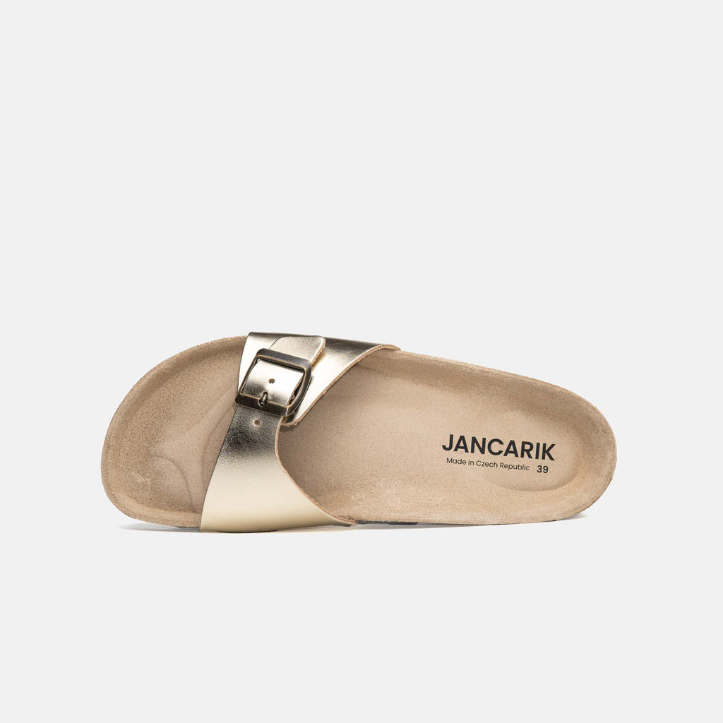 U pantoflí je možné individuální a optimální nastavení svršku pomocí kovových přezek.