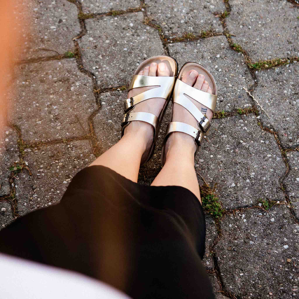 U pantoflí je možné individuální a optimální nastavení svršku pomocí kovových přezek.